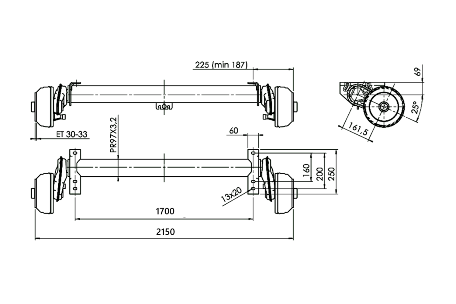De geremde as van de fabrikant AL-KO is bedoeld voor zware aanhangwagens of takelwagen met een maximaal draagvermogen van 1350 kg voor een enkele as en 2700 kg voor een tandemas . De padmaat is 1700 mm, de afstand van de flensmaat is 2150 mm , waardoor eenvoudige montage op een groot aantal voertuigen mogelijk is. De steekmaat van 5x112 garandeert compatibiliteit met de meeste wielen die op de markt verkrijgbaar zijn. De lengte van de veerarm is 161,5 mm, wat zorgt voor stabiliteit en optimale demping, waardoor de rijveiligheid toeneemt, zelfs bij volledige belading.