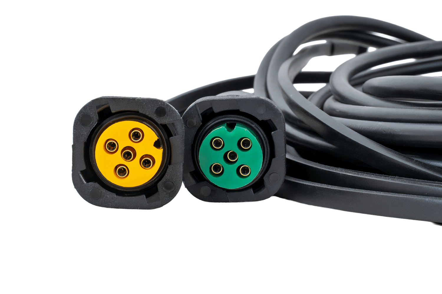De kabelboom is voorzien van twee 5-polige bajonetaansluitingen voor het aansluiten van de achterlichten. Het bajonetsysteem zorgt voor een snelle en veilige installatie, waardoor het risico op onbedoelde loskoppeling tijdens het rijden wordt voorkomen. Het ontwerp van de connectoren garandeert een waterdichte verbinding en beschermt de contacten tegen corrosie. Dit garandeert een langdurige, storingsvrije werking van de volledige verlichtingssysteem van de trailer.