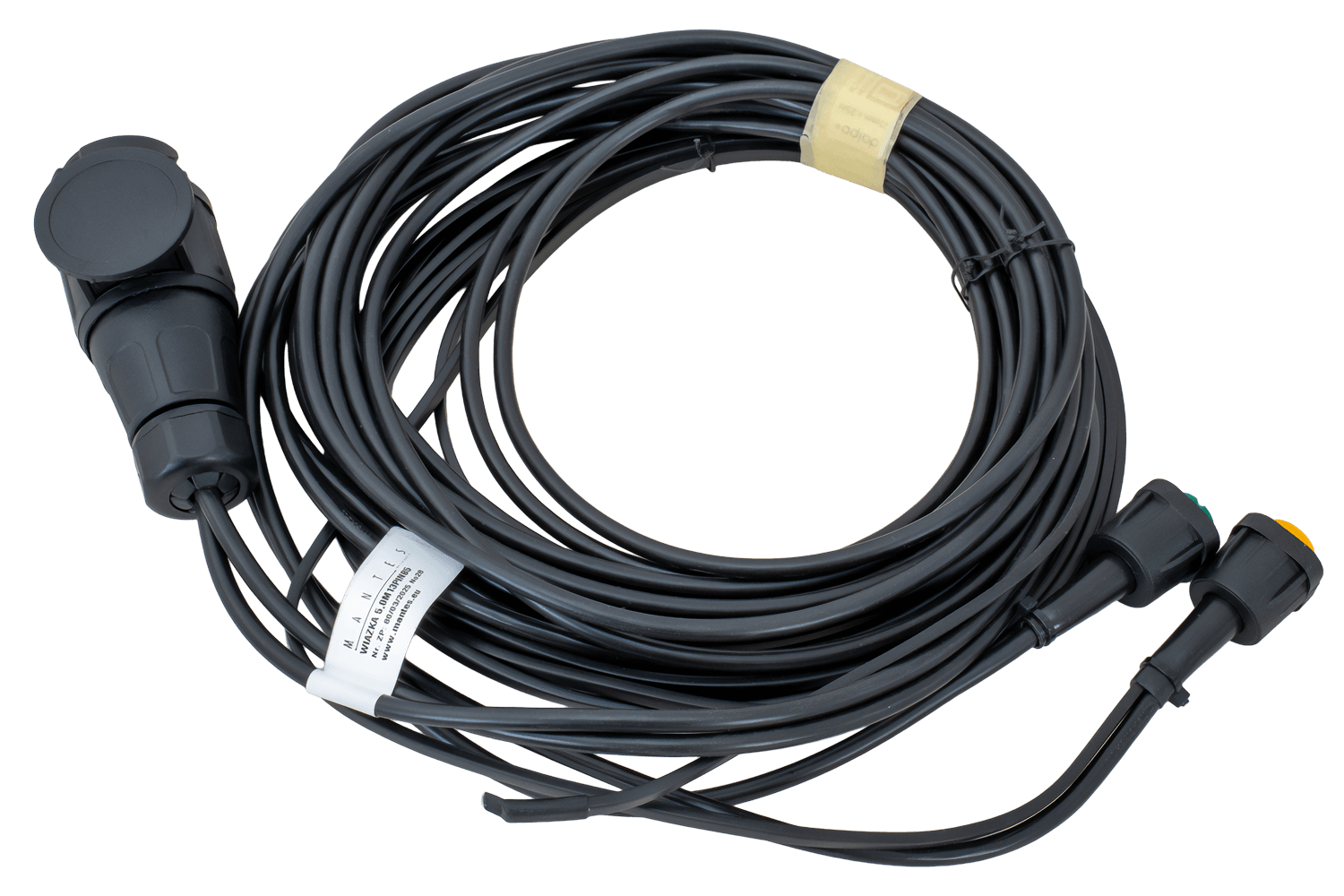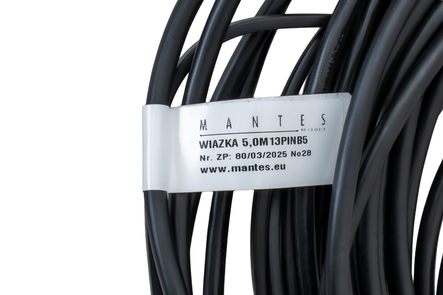 - Elektrische installatie van MANTES voorzien van een 5 m lange hoofdkabel met een 13-polige stekker. De kabelboom zorgt voor een goede werking van de verlichting in vrachtwagentrailers en diepladers. Het heeft de 5-polige bajonetaansluitingen.