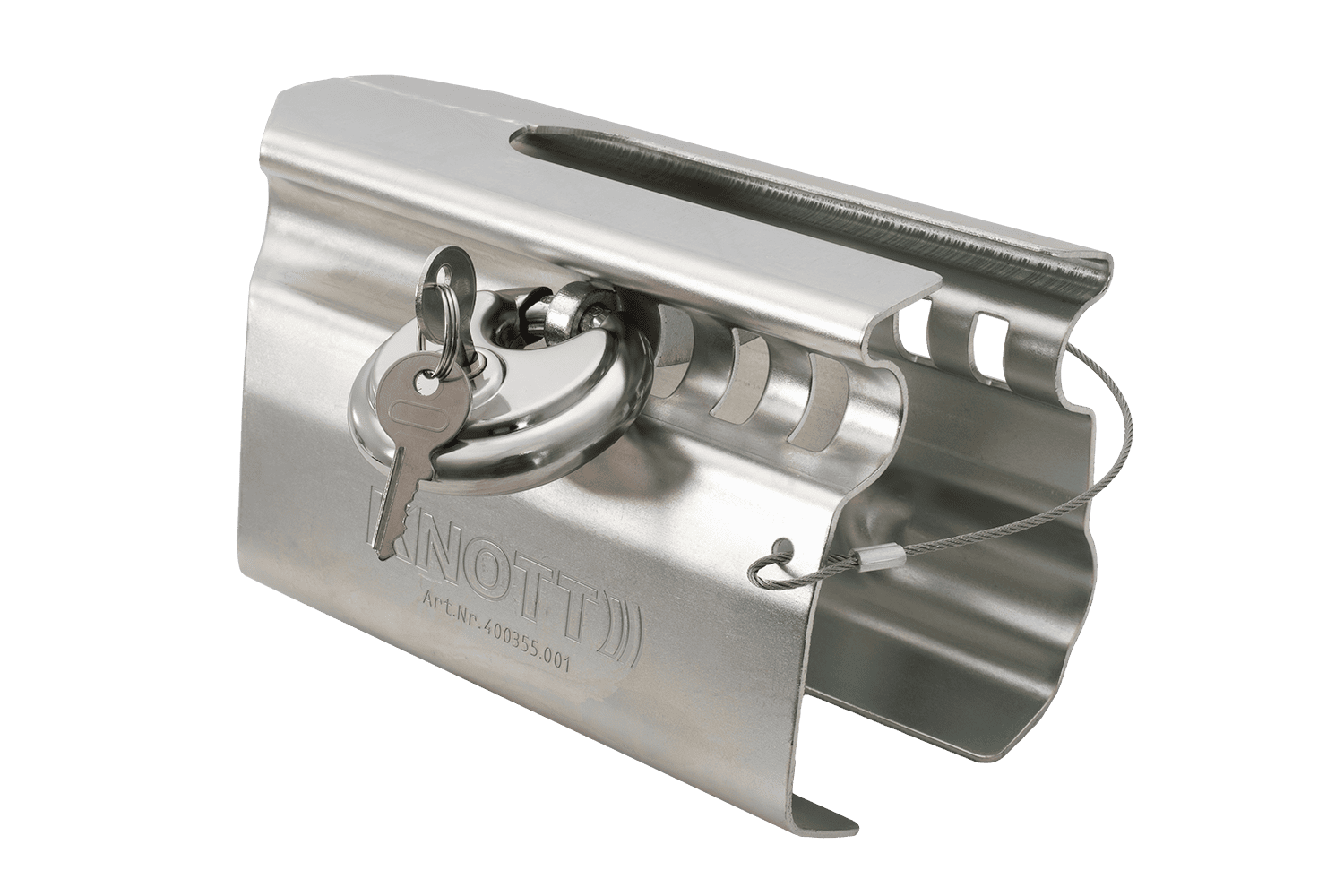 - De universele diefstalbeveiliging van KNOTT is een solide mechanische beveiliging voor alle standaard kogelkoppelingen. Het beschermt de aanhanger effectief tegen onbevoegd aankoppelen en diefstal. Ideaal voor parkeren onder alle omstandigheden.
