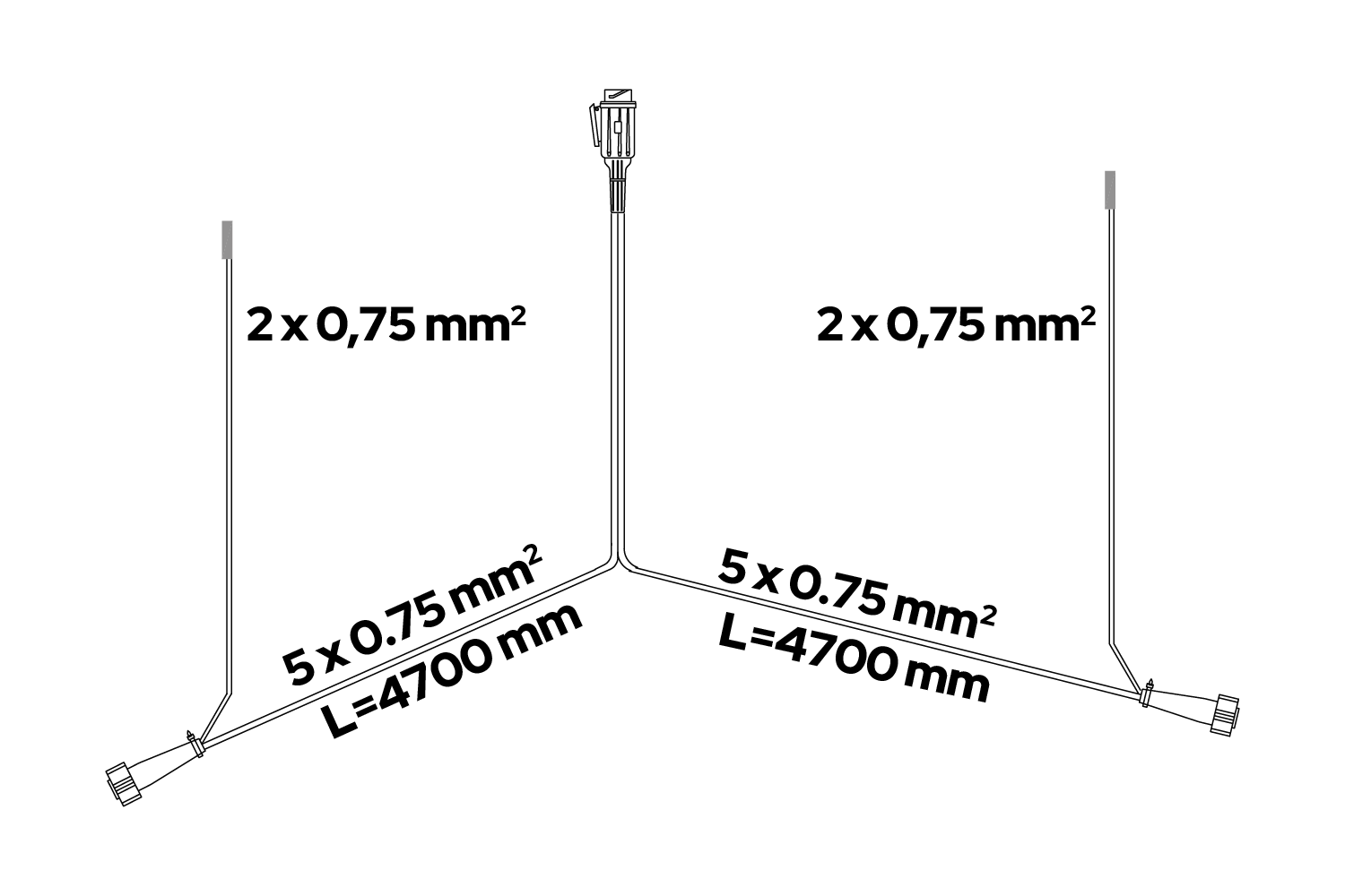De kabelboom is voorzien van twee 5-polige bajonetaansluitingen voor het aansluiten van de achterlichten. Het bajonetsysteem zorgt voor een snelle en veilige installatie, waardoor het risico op onbedoelde loskoppeling tijdens het rijden wordt uitgesloten. Het ontwerp van de connectoren garandeert een waterdichte verbinding en beschermt de contacten tegen corrosie. Dit zorgt voor een langdurige, storingsvrije werking van de gehele verlichtingsinstallatie van de trailer.