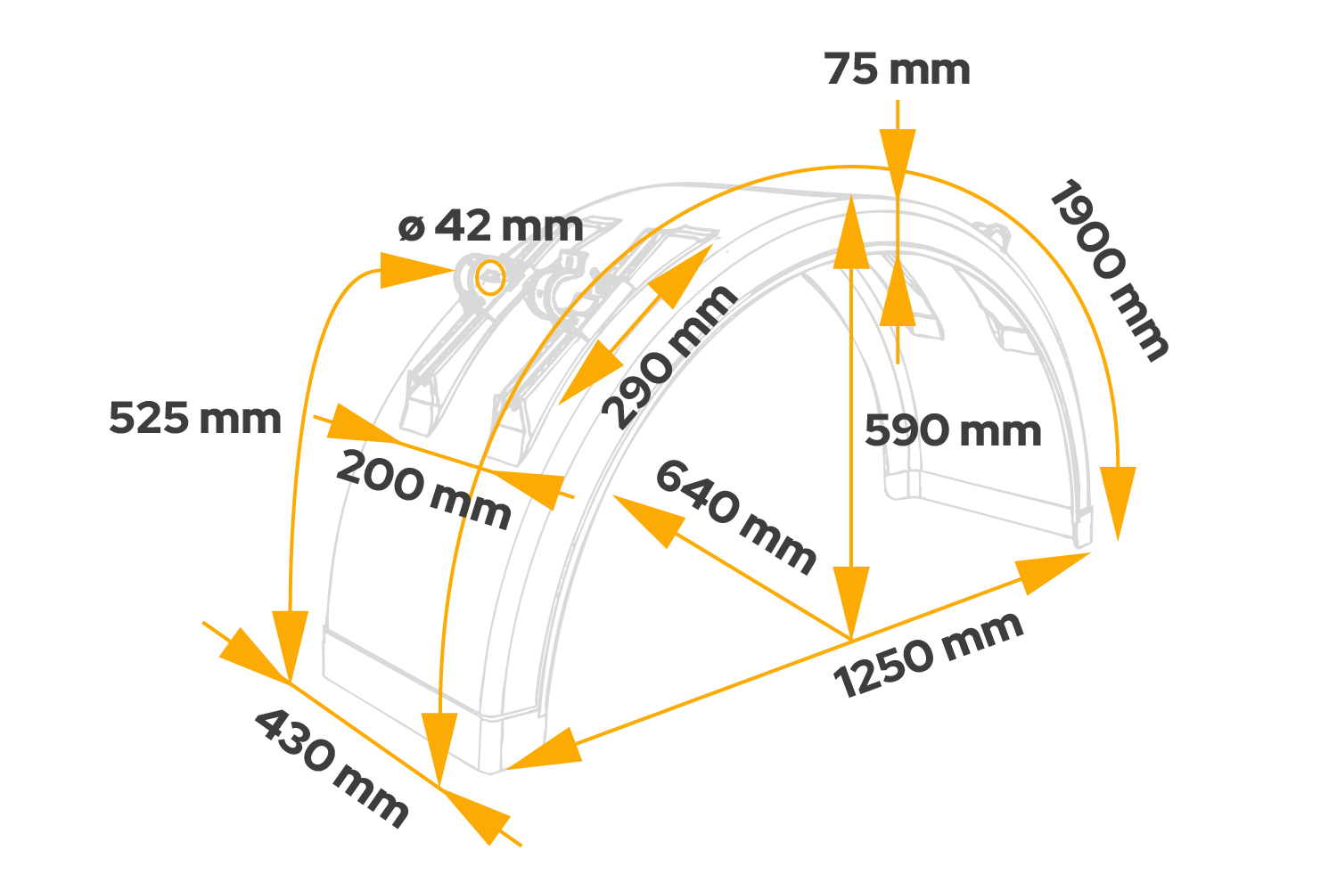• Spatbord met montagebeugels DK2975, geschikt voor wielen van 19,5 tot 22,5 inch, heeft een lengte van 1250 mm en een breedte van 430 mm. Het beschermt de aanhanger en lading tegen schade en andere weggebruikers tegen opspattend modder of stenen onder de w