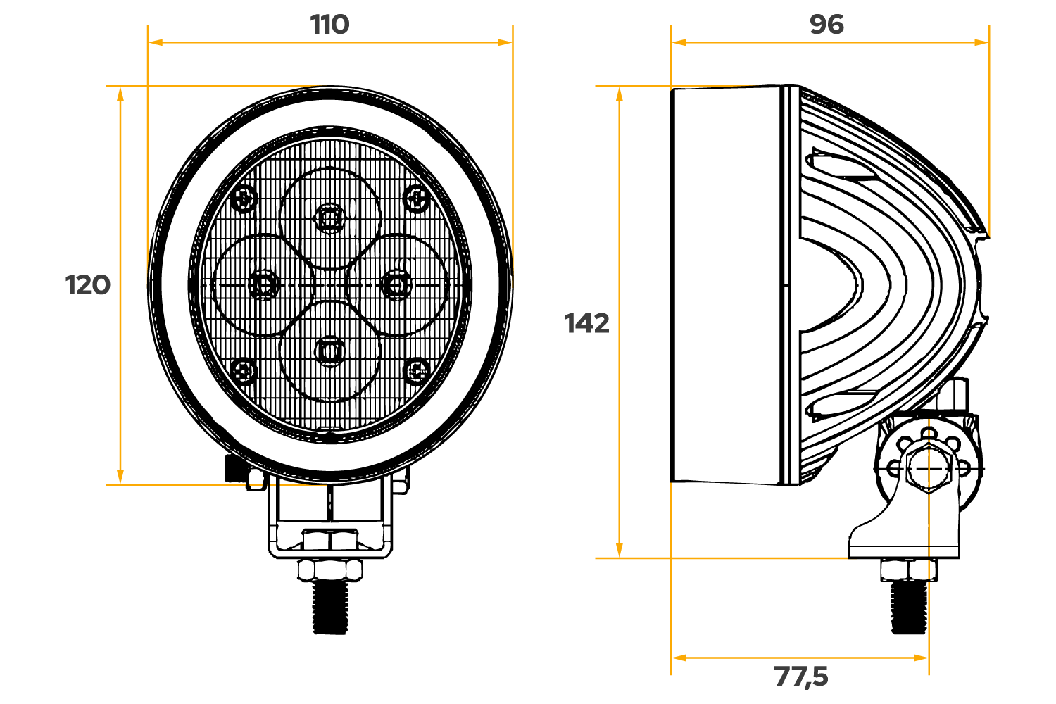 De lamp kenmerkt zich door een hoge bestendigheid tegen schokken, trillingen en extreme temperaturen van -40°C tot +80°C, wat een betrouwbare werking garandeert, zelfs onder zware werkomstandigheden. Dankzij de instelbare stralingshoek kunt u de lichtbundel nauwkeurig afstellen. Zo wordt het risico op verblinding van andere weggebruikers geminimaliseerd en worden het werkcomfort en de veiligheid vergroot. Bovendien voldoet de lamp aan de eisen van de CISPR 25 Klasse 4- norm, wat inhoudt dat de lamp zeer efficiënt elektromagnetische ruis vermindert . Hierdoor verstoort de lamp de werking van andere elektronische apparaten in het voertuig niet en kan hij veilig worden gebruikt in moderne machines met gevoelige elektronica.