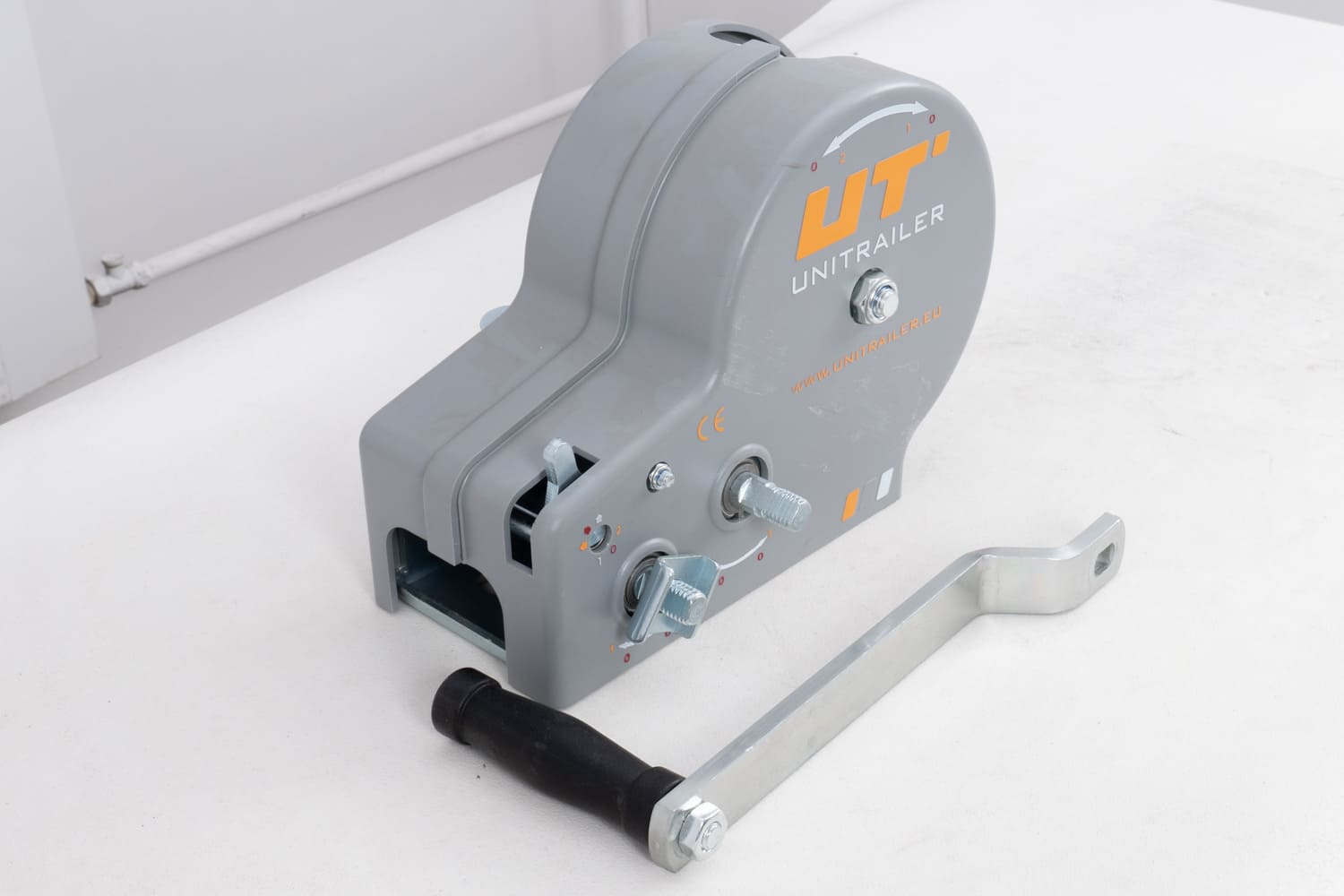 Handmatige lier UNITRAILER Ontworpen om boten, quads en andere voertuigen op een aanhanger te trekken. Ontworpen voor boottrailers. Gemaakt van gegalvaniseerd staal , met het UNITRAILER-merklogo aan de zijkant.