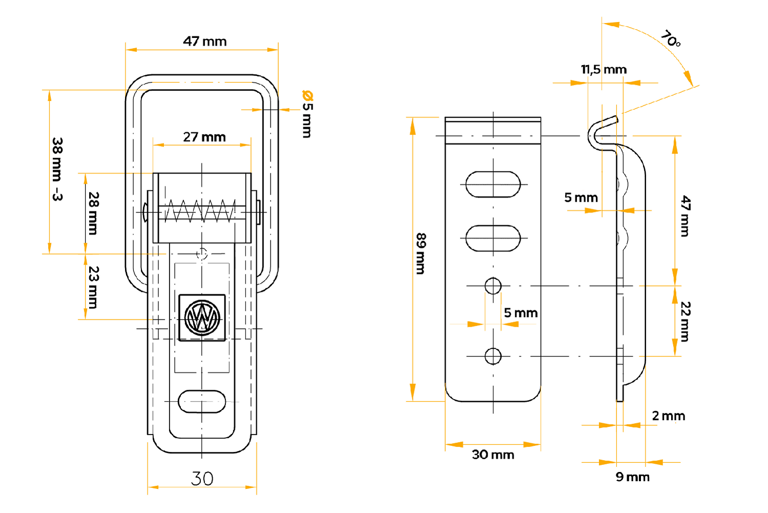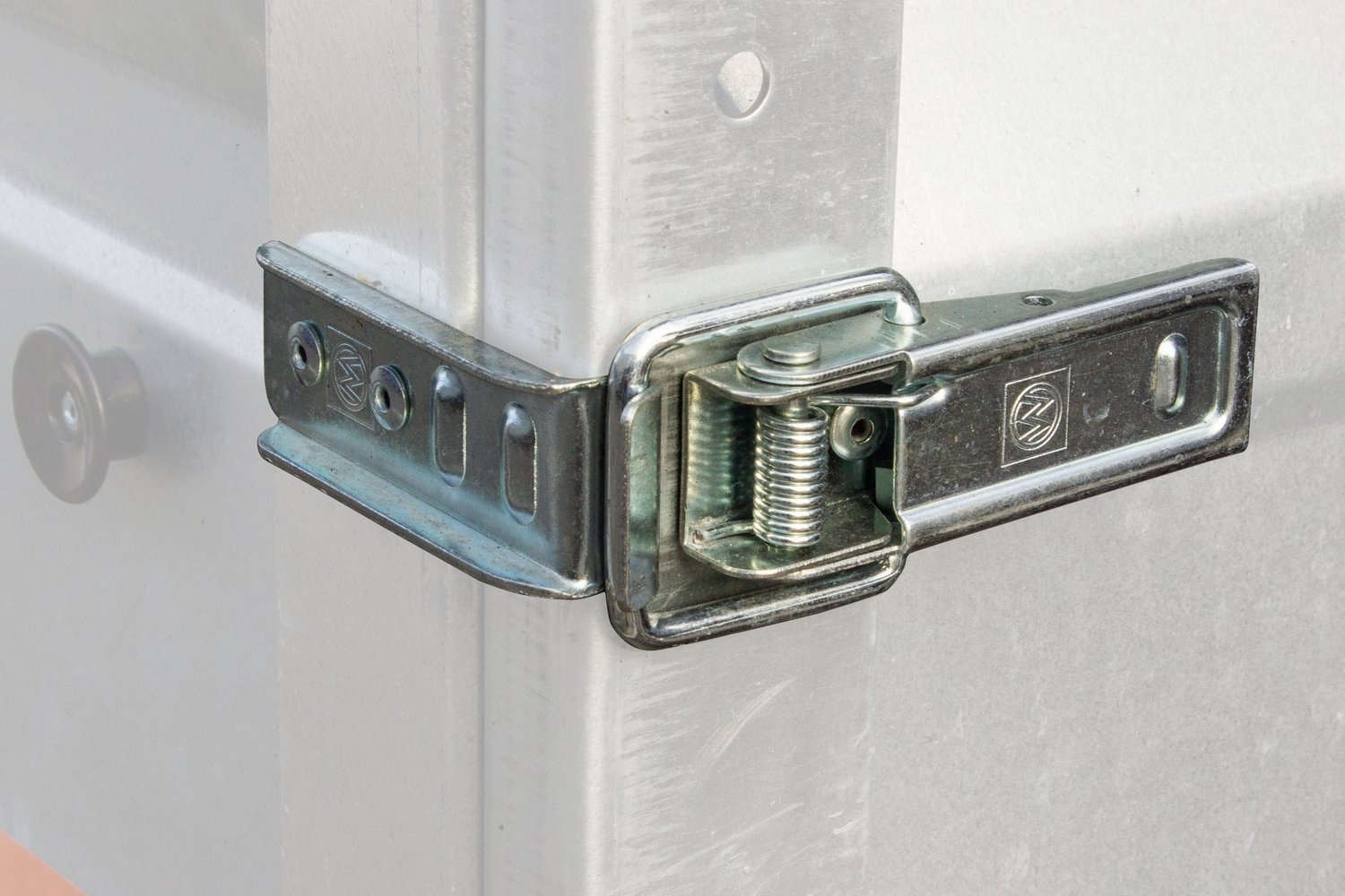 De BV 60-1 trekhaak is voorzien van een geïntegreerde veersluiting die onbedoeld openen van de achterklep tijdens het rijden voorkomt, wat de transportveiligheid verhoogt. De 89 mm lange BVG 60-A sluiting werkt naadloos samen met de trekhaak en zorgt voor een complete en stabiele sluiting van de achterklep of zijpanelen.