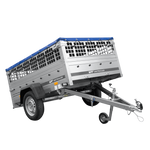Enkelassige aanhanger 200x125 UNITRAILER GARDEN 201 KIPP met gaaswanden en blauwe afdekking